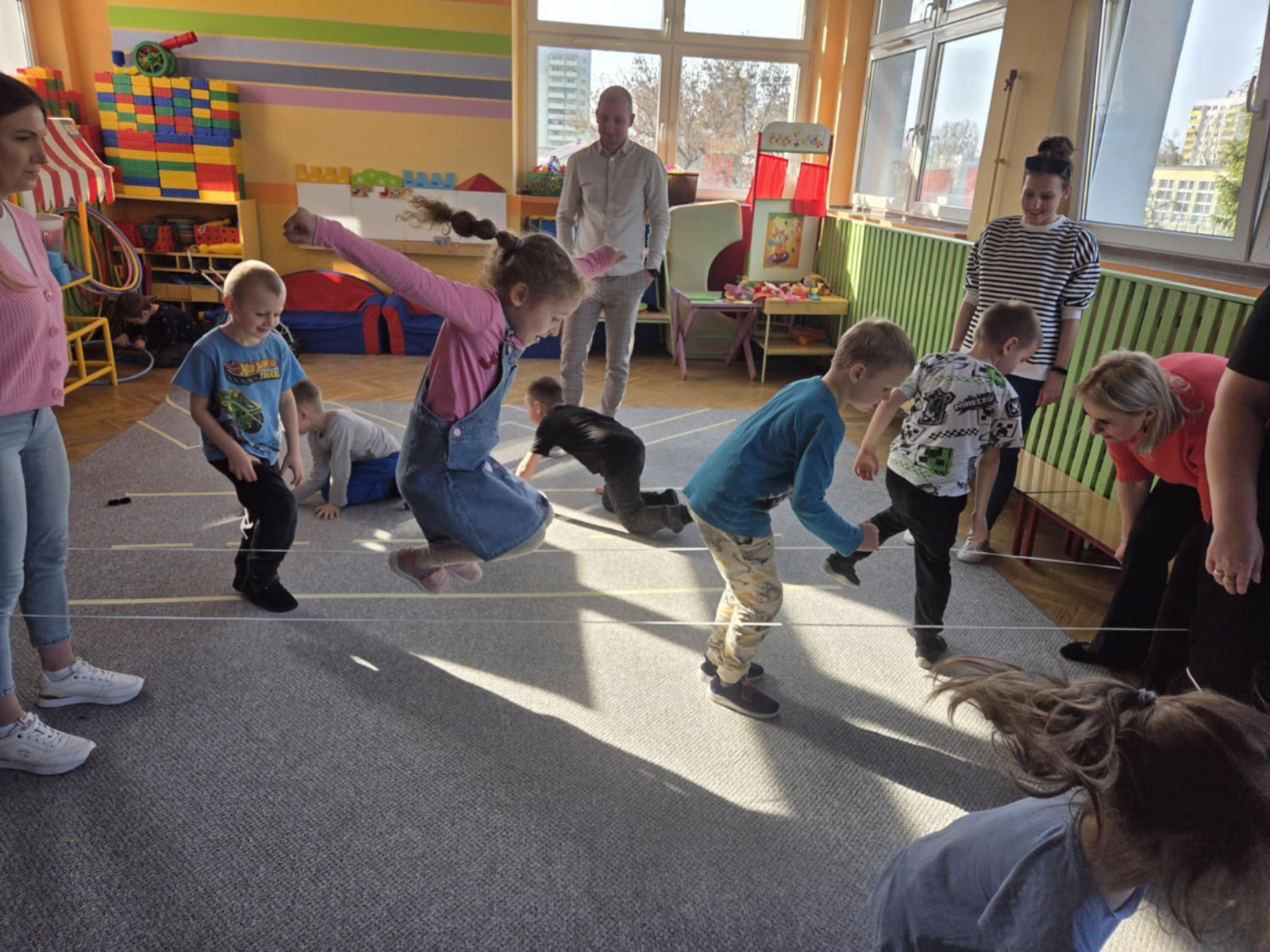 rodzice i dzieci podczas zabawy z wykorzystaniem gumy