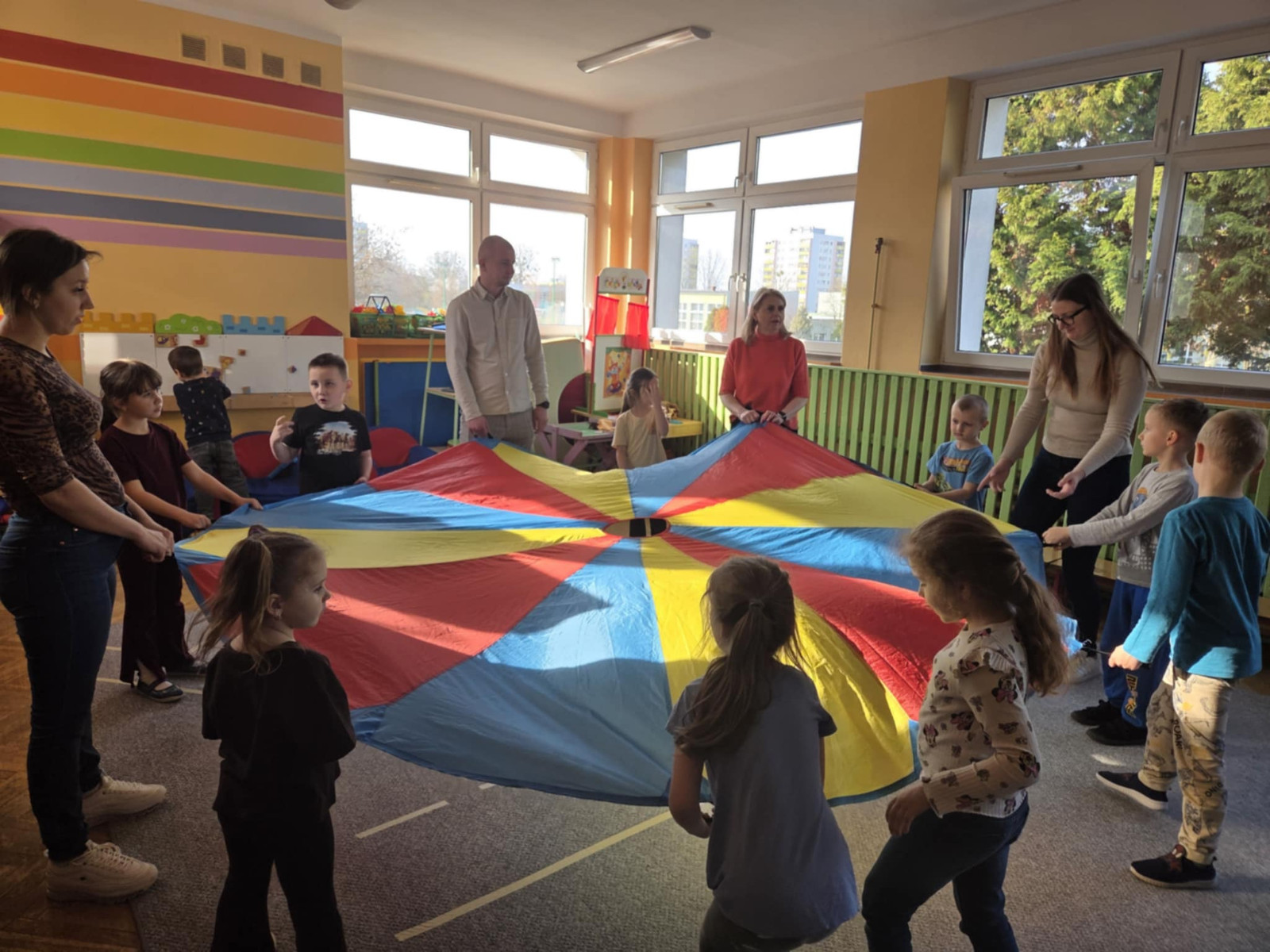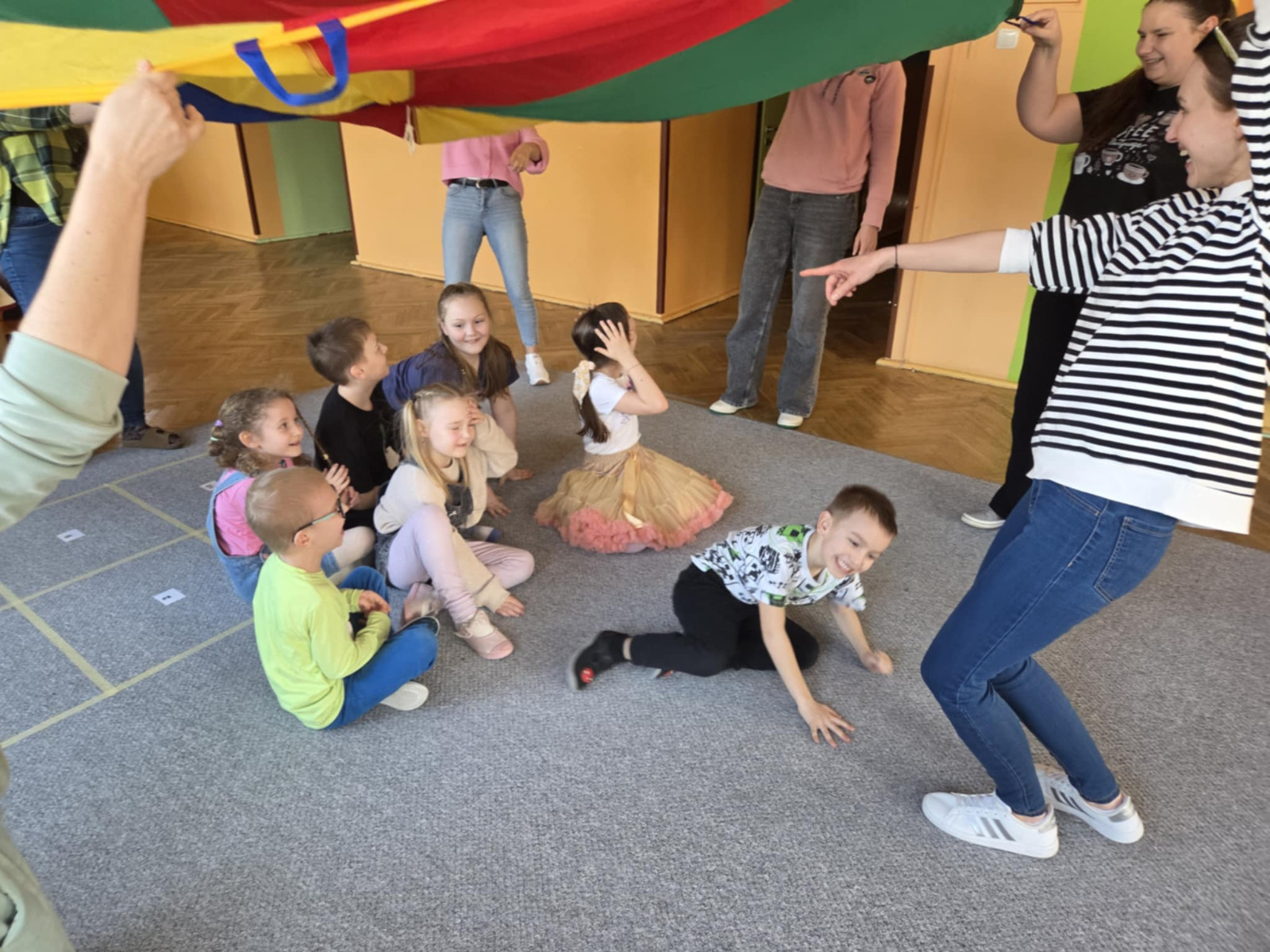 dzieci i rodzice podczas zabawy chustą animacyjną