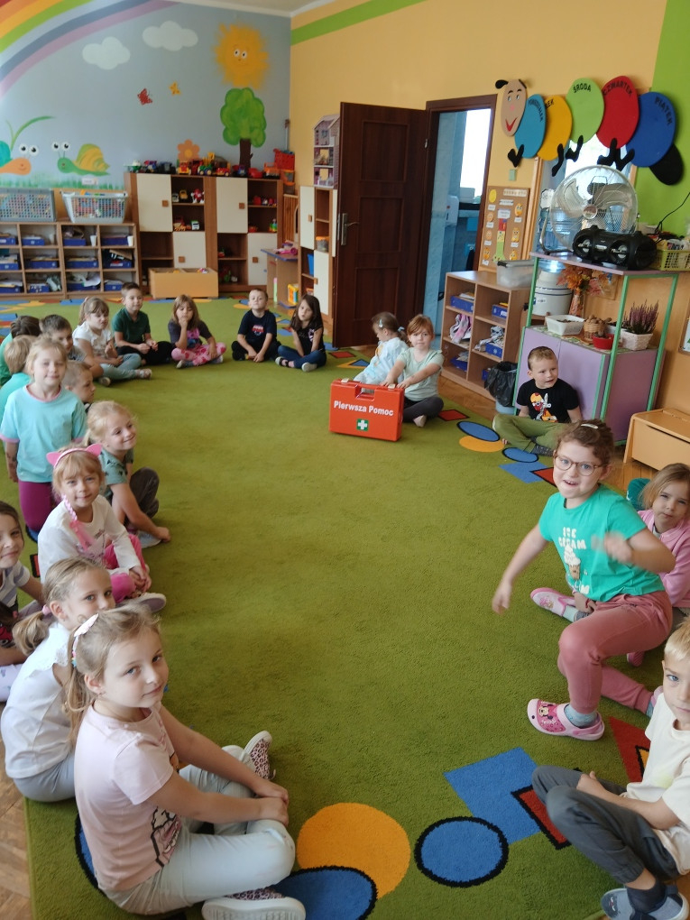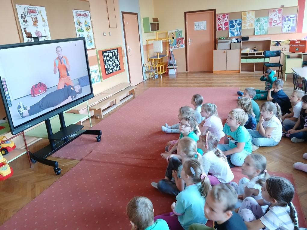 dzieci ogladają film jak udzielić pomocy poszkodowanemu