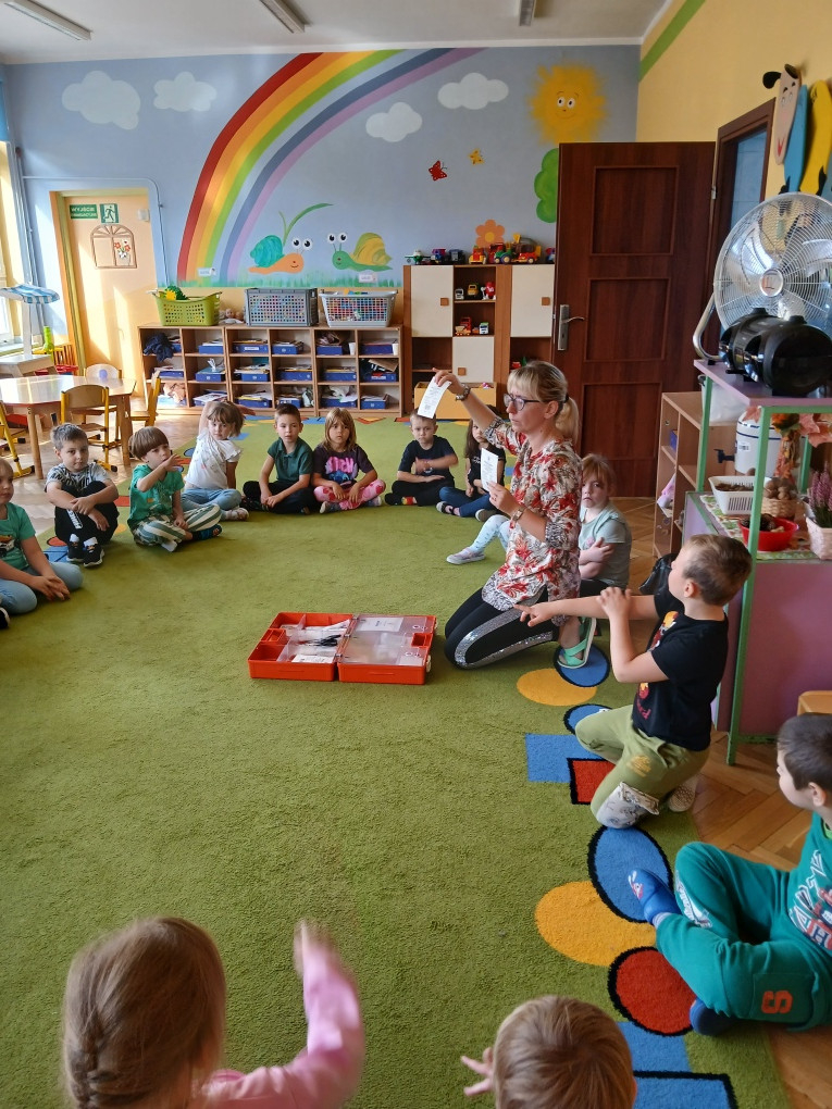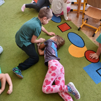 nauczzyciel demonstruje dzieciom udzielanie pierwszej pomocy