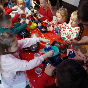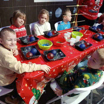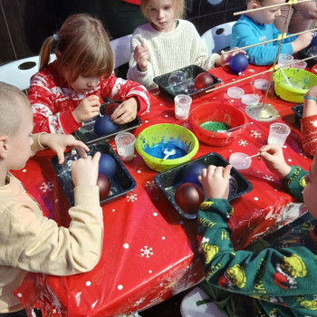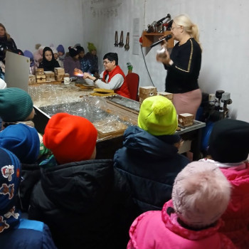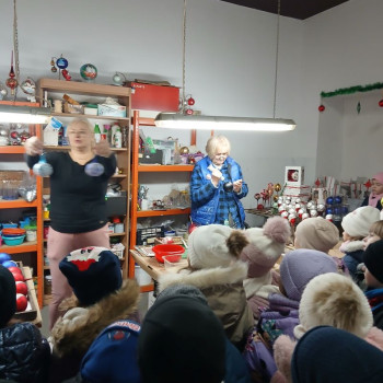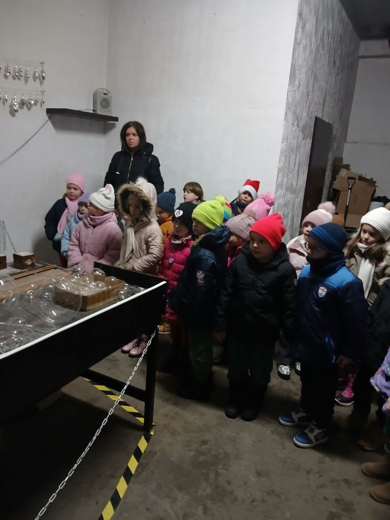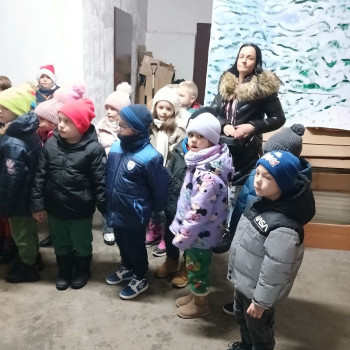 dzieci pozują do zdjęca przed wejściem do Fabryki